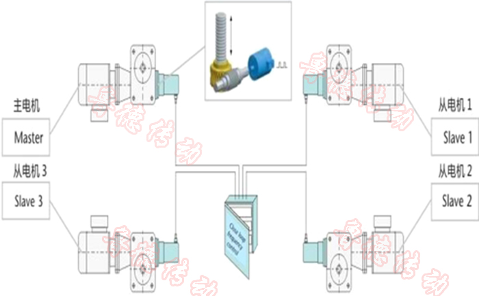 與轉向器、連接桿、聯軸器等附件組合,用一臺電機驅動,保 證平臺同步穩定運行。在無法布置機械聯動的工況中還可采用電氣控制實現聯動,以絕 對值編碼器以及PLC控制來實現同步定位精度。