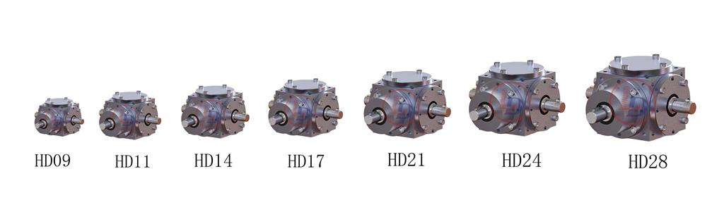 4、HD系列換向器共有七種規格,選型范圍大,輸出軸形式多樣,可滿足多種場合的需要。